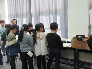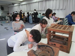 3年生が、社会の時間、昔のくらしの道具を実際、手に取りながら、学習を進めていました。「これ、何?」と口々に言いながら、不思議そうに道具を観察していました。