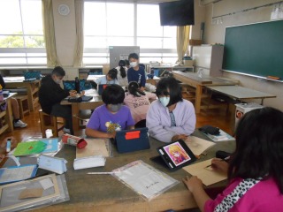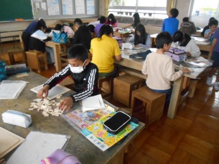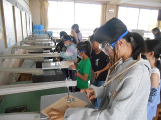 電動の糸のこを使い、パズルを製作していました。ゴーグルをして、安全に作業をしていました。