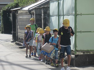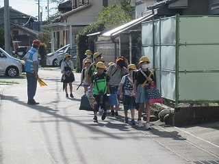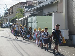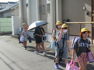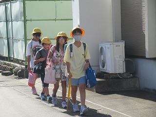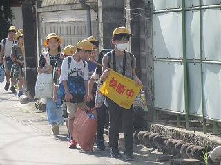 夏休みも終わりました。今日から、元気に学校生活をスタートさせてくださいね。東門の通学班の様子です。