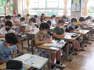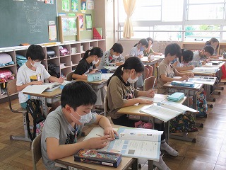 4年1組では、理科の時間、ノートに学習のまとめをしているところでした。みんな真剣に取り組んでいました。