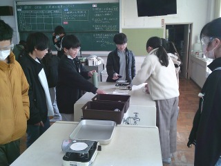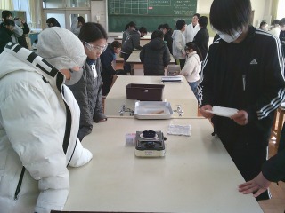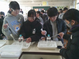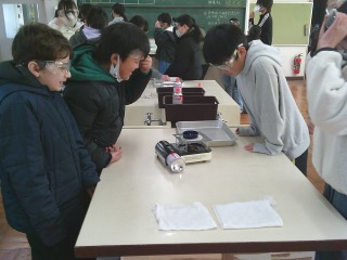 食塩水を蒸発させる実験を行っていました。火にかけると何が起こるか、火を消した後に何が残るかなどについて観察していました。