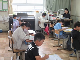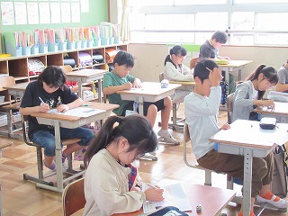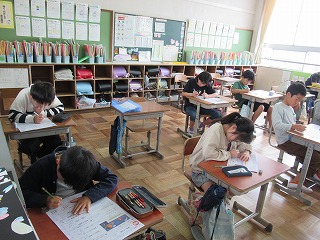 4年1組は算数の時間でした。算数のテストに取り組んでいました、4年生の学習内容を単元テストで確認して、理解が足らないところを復習しましょう。