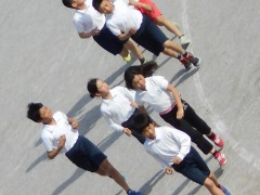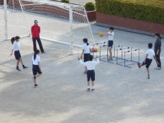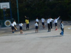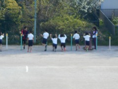 ボール投げの準備運動は腕を肩を回す。ハードルのフォームをチェックするI先生。