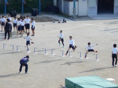 幅跳びの準備運動に鉄棒を利用。高跳びの準備運動は縄跳びとボールを使って。