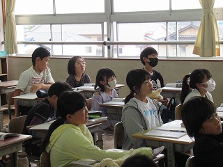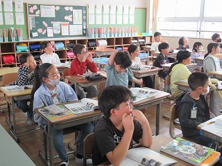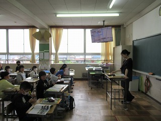 4年2組は社会の時間でした。愛知県の地図をモニターに映しながら、担任の先生が有名な建物の説明をしていました。