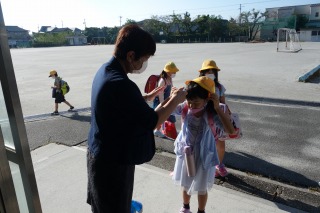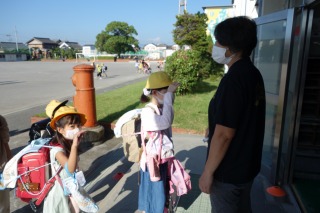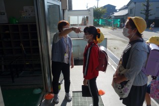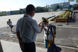 今朝も昇降口では、検温が行われています。今日もみなさんは、きちんと距離をとって並べていましたね。