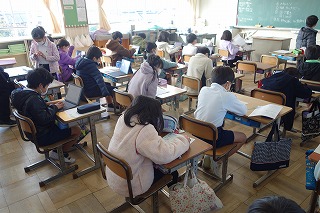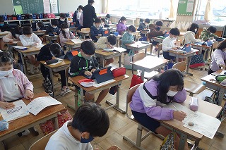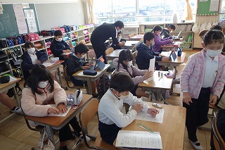 3年2組の算数は、かけ算のひっ算の学習でした。プリントの問題に取り組みました。