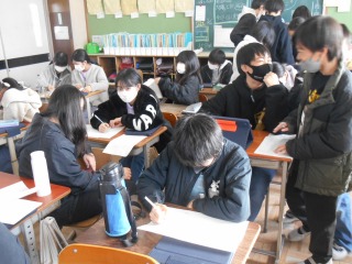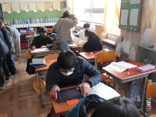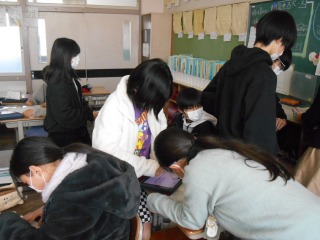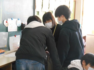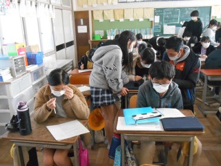 6年生のまとめのプリントに取り組んでいました。面積の難しい問題もあり、相談しながら考えていました。