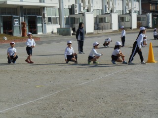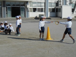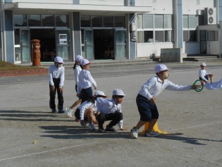 小さな輪をバトンにし、リレーをしていました。各グループ、待っている子は走っている子を応援していました。