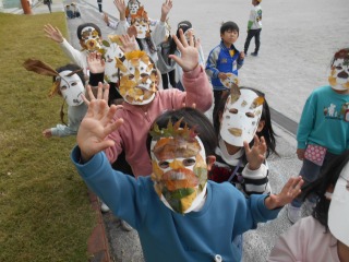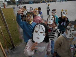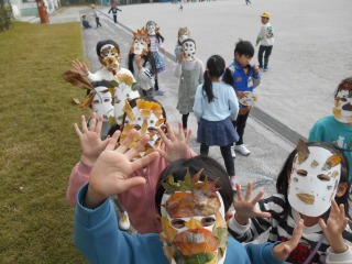 生活科の学習です。枯れ葉や木の実などを持ち寄り作ったお面をかぶって、休み時間に運動場を歩いていました。このお目をかぶりながら「こんにちはー」と言ったと思ったら、そのあとは「ガオー」などと驚かせられました。秋を感じる、楽しい活動でした。