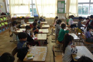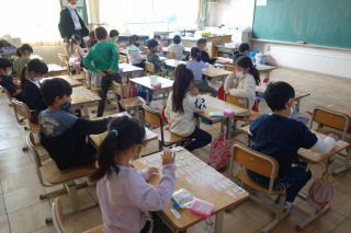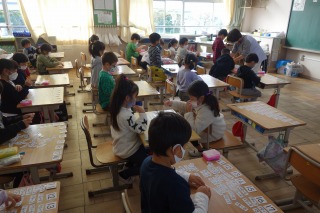 1年2組の算数は、たし算の学習でした。同じ答えになるたし算カードを探して、仲間分けをしました。