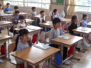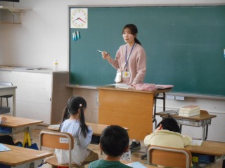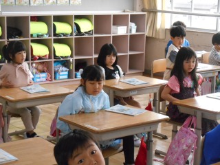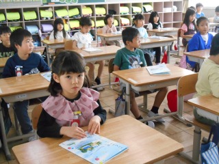 正しい姿勢を作るためのコツを学習していました。「ぐー、ぺた、ぴん」と言いながら姿勢づくりをしていました。
