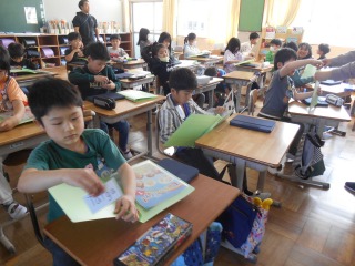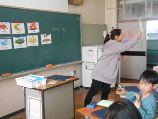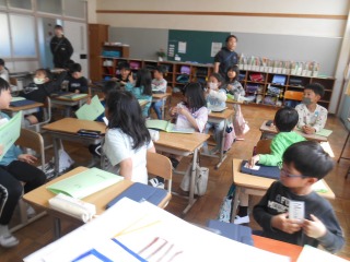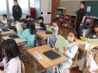本年度初めての外国語の授業。授業の終わりにファイルへの教材の片付け方を確認していました。