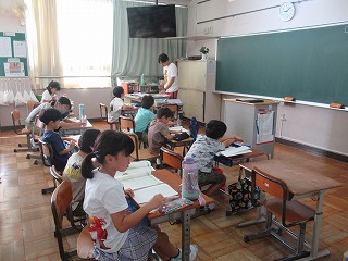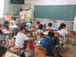 2年2組は、国語の時間でした。単元の題名をノートに書き写して、これから取り組む課題の説明を聞いていました。