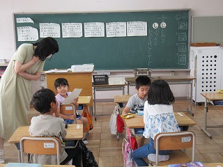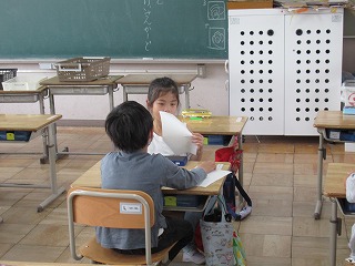 1年1組では、みーわんタイムが行われていました。向かい合って会話を楽しんでいました。