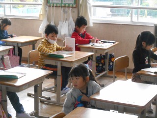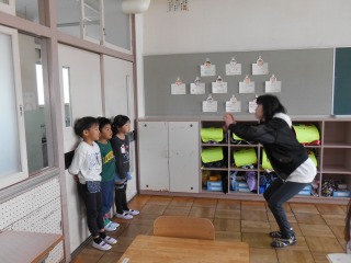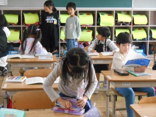 係を決め、誰が度の係かがわかるように、写真を写して掲示します。待っている子は静かに自由帳でお絵描きをしていました。