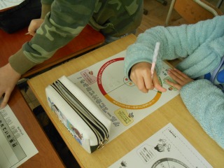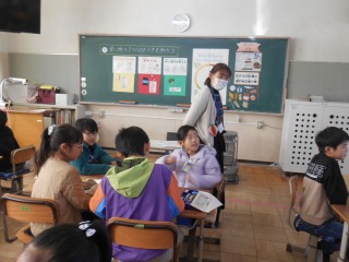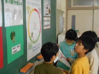 給食の栄養について考える授業をしていました。食材を色分けし、栄養を考えます。