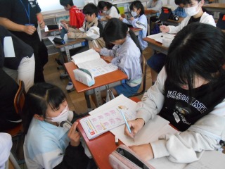 体積の問題を解いていました。わからないところがあると、友達と相談しながら答えようと頑張っていました。