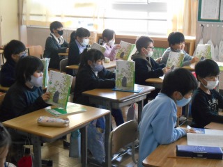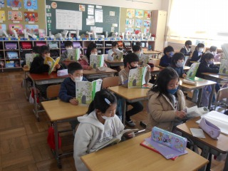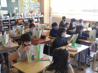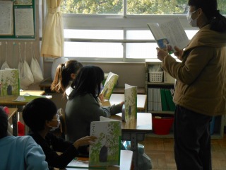 音読練習をしていました。グループに分かれ、1文1文声を合わせて読んでいました。