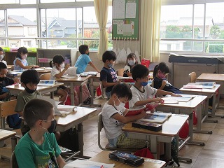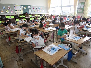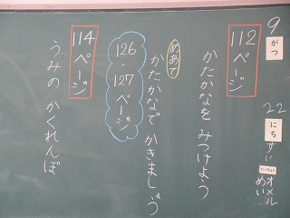 1年2組では、国語の授業を行っていました。「かたかなをみつけよう」というめあてで、授業が進められていました。
