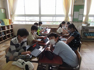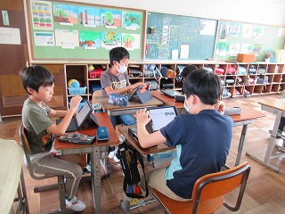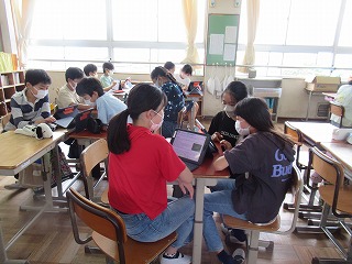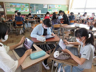 6年2組では、タブレットを使い、修学旅行のまとめを行っていました。