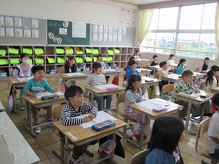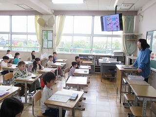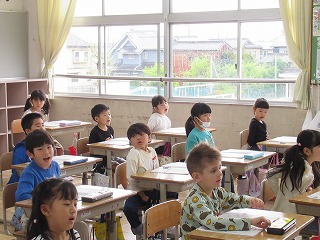 1年1組は国語の時間でした。姿勢の確認や鉛筆の持ち方の確認など、リズムに乗せて覚える活動を行っていました。