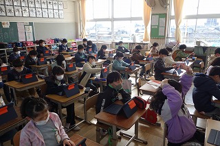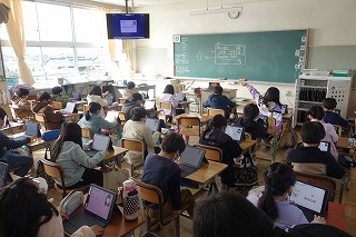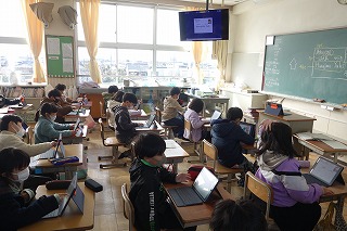 3年2組の総合的な学習は、タブレット端末を使って自分の名刺をつくりました。