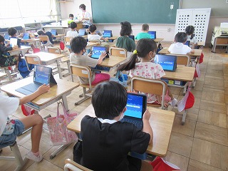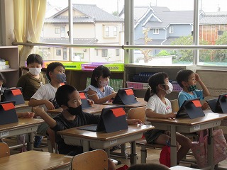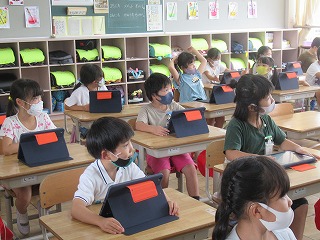 1年2組では、タブレットを使い、授業が行われていました。1年生の子どもたちも積極的に使っています。だんだん慣れていってくださいね。