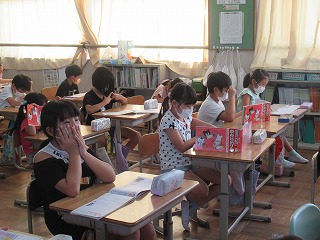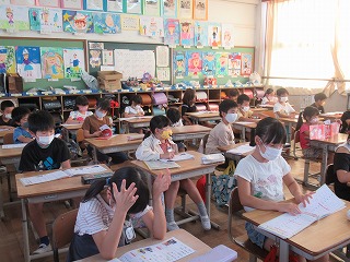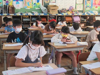 2年1組では、漢字のテスト前に3分間の学習タイムとして、漢字を覚える時間が取られていました。みんな真剣に復習していました。