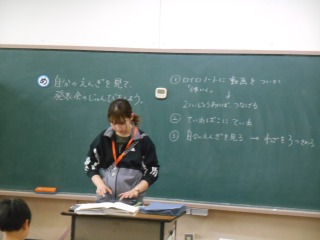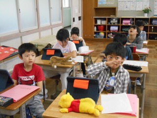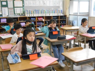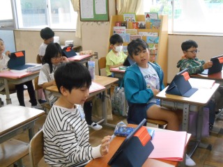 マット運動の種目を組み合わせて、演技を作ります。それぞれでできる技をどの順番で行うか、タブレットに入力していました。
