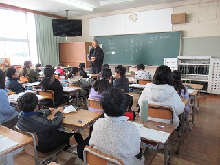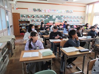 4年1組では、朝の会の時間、先生の話を聞いていました。