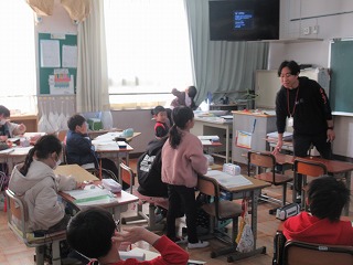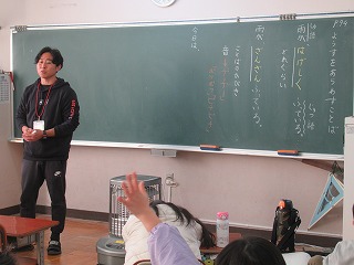2年2組は国語の時間でした。様子を表す言葉の学習で、はげしくふっているや、ざんざんふっているといった様子の言葉の種類を確認していました。