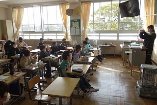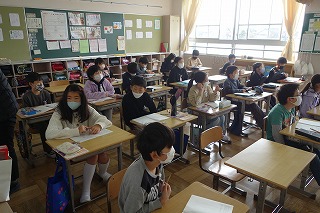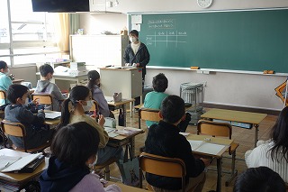 4年1組の算数は、平面について学びました。立体の平面の数などについてみんなで考えました。
