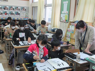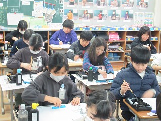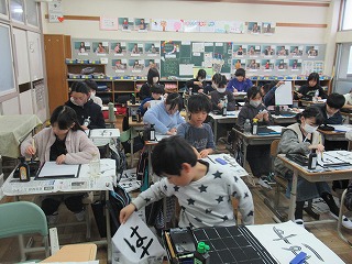4年1組は書写の時間でした。「はす」の字の、止めや払いを意識しながら、丁寧に取り組んでいました。