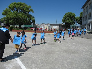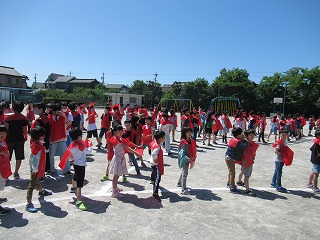 みんなが赤と青のエプロンを身につけて、運動場のラインに並んで撮影を行いました。青空のもと、元気な笑顔が並んでいました。写真のできあがりが楽しみですね。