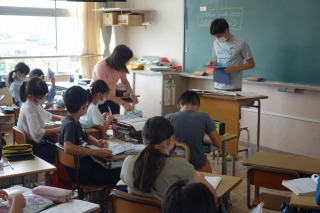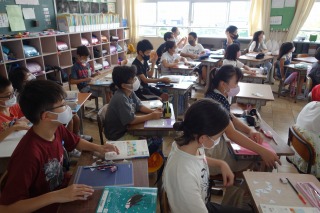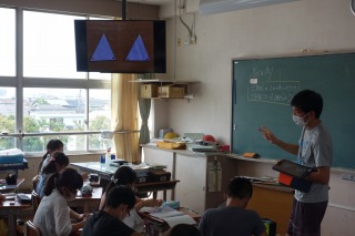 5年2組の算数は、図形の学習でした。三角形の3つの角のきまりについて、紙の図形を使って、みんなで考えました。