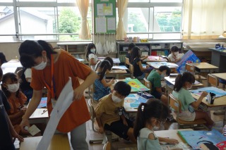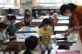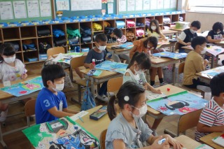 2年2組の図工は、絵の学習でした。自分の描いた絵に名札を書いて貼り付け、完成させました。