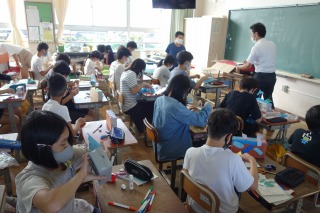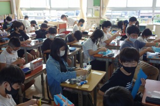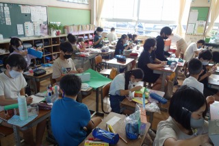 6年1組の図工は、「くるくるクランク」の制作でした。色紙を貼るなどの工夫を加えて仕上げに取り組みました。