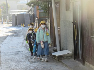 東門の通学班の様子です。道路が凍っているため、ゆっくり慎重に歩く姿が見られました。