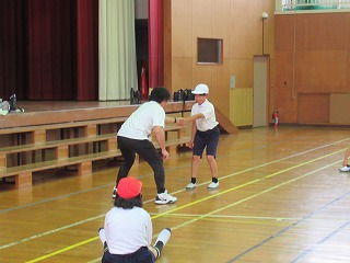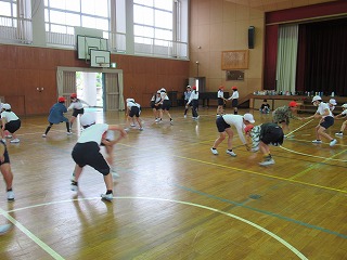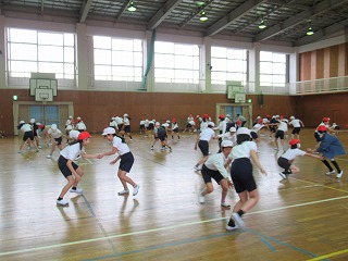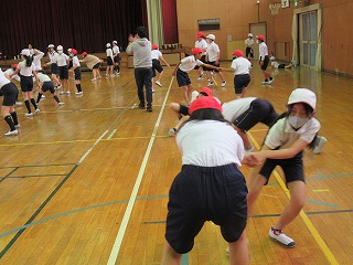 6年生は体育の時間でした。ペアと手をつないで、相手のひざを触るという運動を行っていました。みんな楽しそうに活動していました。
