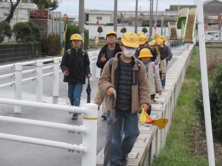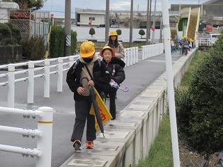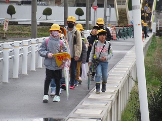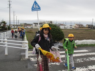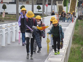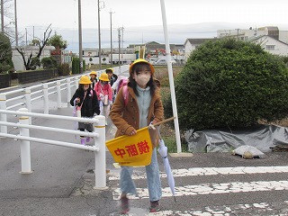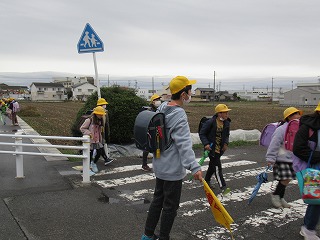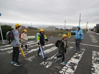 北門の通学班の様子です。今日は、どんより曇っています。また、見守り隊の方に横断歩道を渡してもらっていました。安全な登校ができていることに感謝です。