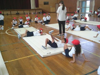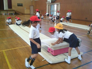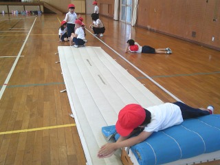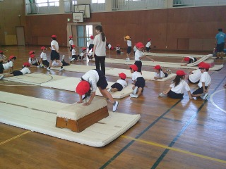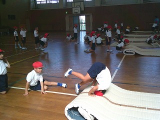 マット運動を行っていました。マットによって、種目が違い、子どもたちはいろんな種目に楽しみながらチャレンジしていました。