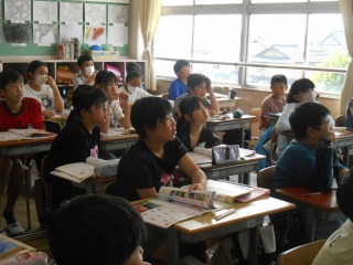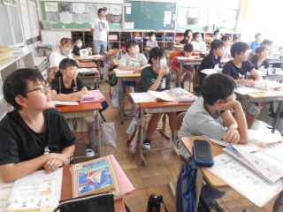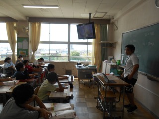 担任の先生が説明をしながら、be動詞を使って自己紹介する文を学習していました。