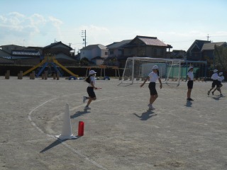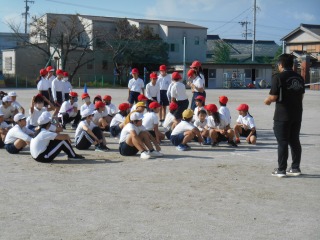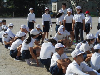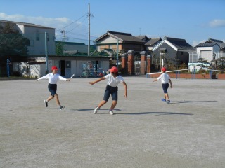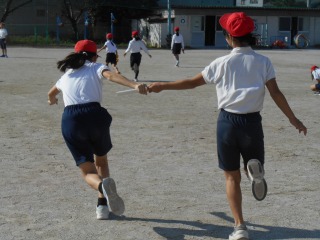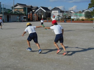 リレーの学習でした。グループに分かれ、どうするとバトンパスが早くできるか、考えながら練習していました。