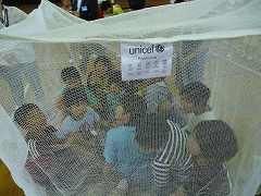 マラリアなど、虫に刺されたことで感染していく病気を予防するため、蚊帳を使うようユニセフの方々が現地で指導されているそうです。1つ300円。わたしたちの募金でたくさんの蚊帳が買えそうです。