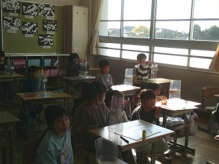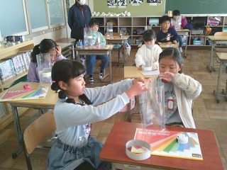 お面の頭に付ける部分を作成していました。二人で協力し合いながら、一つずつを作っていました。