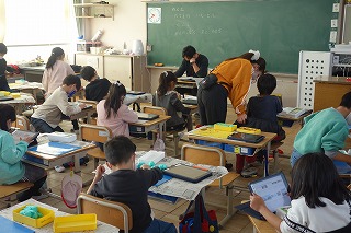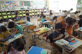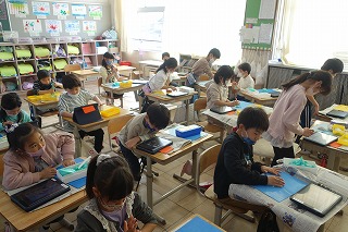 1年1組の図画工作は、タブレット端末で調べた建物を参考にして粘土で建物をつくりました。
