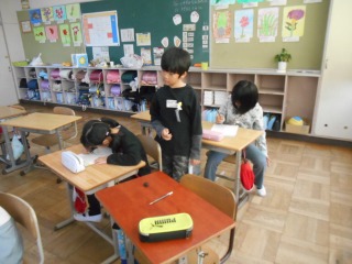 1年生が楽しんでくれるように、おもちゃを作りました。どんな工夫をしたか、1年生はどのように参加してくれたかをワークシートに書いていました。