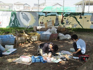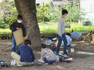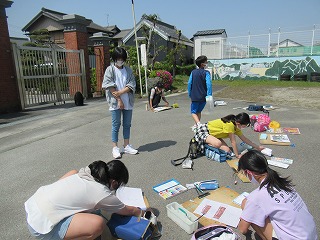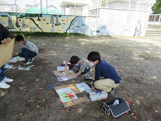 6年2組が、図画工作の時間、外に出て風景画に挑戦していました。