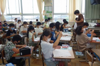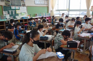 6年2組の家庭科は、裁縫の学習でした。ひとりひとりが、裁縫の実習を進めました。